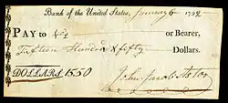 According to the plan put before the first session of the First Congress in 1790, Hamilton proposed establishing the initial funding for the First Bank of the United States through the sale of $10 million in stock of which the United States government would purchase the first $2 million in shares. Hamilton, foreseeing the objection that this could not be done since the U.S. government did not have $2 million, proposed that the government purchase the stock using money lent to it by the bank; the loan to be paid back in ten equal annual installments.[6] The remaining $8 million of stock would be available to the public, both in the United States and overseas. The chief requirement of these non-government purchases was that one-quarter of the purchase price had to be paid in gold or silver; the remaining balance could be paid in bonds, acceptable scrip, etc.[7]