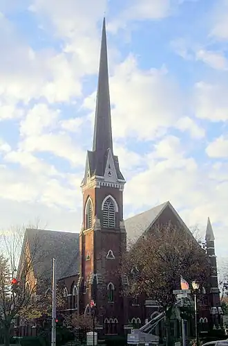 The First Baptist Church of Fairport is a historic Baptist church located at 94 South Main Street at Church Street in Fairport, Monroe County, New York. It was built in 1876, and is a 2+1⁄2-story, cruciform plan, High Victorian Gothic church. It is constructed of brick and rests on a Medina sandstone foundation. It has a large square corner tower topped by a tall narrow spire. It features ornamental stone trim, a steeply pitched gray slate roof, and 72 original stained, leaded glass windows.[2]: 5 In 2006 a national drugstore tried to buy the land but, in response to adverse local reactions including a concert held by local youth musicians, money was raised to help repair the church instead.