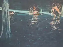 ![]() USS Quincy being illuminated by searchlights of Chōkai, on fire and sinking from Japanese torpedoes | |||||||