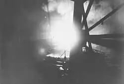 Astoria's bridge crew called general quarters upon sighting the flares south of Savo, around 01:49. At 01:52, shortly after the Japanese searchlights came on and shells began falling around the ship, Astoria's main gun director crews spotted the Japanese cruisers and opened fire. Astoria's captain, awakened to find his ship in action, rushed to the bridge and ordered a ceasefire, fearful that his ship might be firing on friendly forces. As shells continued to cascade around his ship, the captain ordered firing resumed less than a minute later. Chōkai had found Astoria's range, and the ship was quickly hit by numerous shells and set afire.[10]: 41–44 [l] Between 02:00 and 02:15, Aoba, Kinugasa, and Kako joined Chōkai in pounding Astoria, destroying the cruiser's engine room and bringing the flaming ship to a halt. At 02:16, one of Astoria's remaining operational main gun turrets fired at Kinugasa's searchlight but missed and hit one of Chōkai's forward turrets, putting the turret out of action and causing moderate damage to the Japanese vessel.[11]: 231 Astoria sank at 12:16 after all attempts to save her failed.