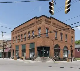 The First National Bank is a historic commercial building located at New Cumberland, Hancock County, West Virginia. The building has also been known as the Graham Building and the Ross Building. It was built in 1903, and is a two-story, four bay blond brick building with an elevated basement. It features an elevated recessed corner entry with a Doric order column at the corner. It was originally occupied by the First National Bank, until it failed in 1927. For 61 years, from 1929 to 1990, the first floor space housed Graham's Department Store.[2]