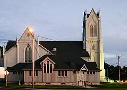 The First Parish Church is an Open and Affirming congregation of the United Church of Christ. The church meetinghouse sits at 217 Maine Street in Brunswick, Maine. Built in 1845 to a design by Richard Upjohn, it is a unique example of Gothic Revival architecture done in wood, as the church was built with vertical board-and-batten paneling.[2] It was listed on the National Register of Historic Places in 1969.[1] The congregation dates to 1717. The Senior Pastor is Rev. John Allen.