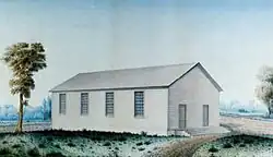 This first church building, really only a lecture hall was only forty by fifty feet in size, it was a wooden building constructed per a contract with Mr. John Stacy, a church member. Authorized on December 24, 1822; and built on land donated by Joseph Ellicott (November 1, 1760 – August 19, 1826) of the Holland Land Company on December 12, 1820; the total cost of construction was $874; Mr. Stacy, however, deducted the cost of a pew for his own use. Thus, money raised from pew sales totaled $100 in excess over the cost of construction. This humble edifice, located on the northwest parcel of land at Main, Church & Niagara Streets was completed in May 1824. The building was on the northeast corner of the plot of land at Pearl Street and Niagara Street with the front of the building facing east, it had two doors in the front with the pulpit standing between those doors. Inside, the pews were square and were lit by candles supplied by the worshipers in the evening, at the west end of the building was a platform for the singers.