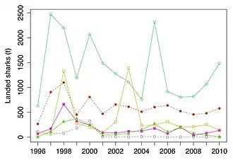 Some sharks are commonly caught, including the blue shark, known scientifically as Prionace glauca, the shortfin mako, known scientifically as Isurus oxyrinchus, the smooth hammerhead, known scientifically as Sphyrna zygaena, the common thresher, known scientifically as Alopias vulpinus, the humpback smooth-hound, known scientifically as Mustelus whitneyi, the school shark, known scientifically as Galeorhinus galeus, the Pacific angelshark, known scientifically as Squatina californica, and other sharks of the Elasmobranchii subclass.[19] From 1950 to 2010, about 372,000 tons of sharks were caught in Peru, with all listed, except the school shark, representing 94% of landings; blue shark represented 42%, shortfin mako represented 20%, smooth hammerhead represented 15%, humpback smooth-hound represented 7%, common thresher represented 6%, and the Pacific angelshark represented 4%. Fishing for these sharks increased between 1996 and 2010, then representing 98% of all shark landings. The year with the most landings was 1973 with 19,718 tons of sharks caught. The sharks are particularly fished for their fins, and Peru, along with Costa Rica and Ecuador, are important suppliers of shark fins to the Asian market.[88]