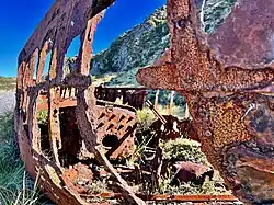 The rusty remains of the Paiaka are now beside the track at the north end of Fitzroy Bay.[8] They were placed there by the Eastbourne Historical Society in 1987.[9] The earliest mention of the steamer seems to have been when she was offered for sale at Evans' Bay as the Perfect Cure in 1878. She then had 3⁄8 in (9.5 mm) iron plates, was 36 ft (11 m) long, 8+1⁄2 ft (2.6 m). wide, 5+1⁄2 ft (1.7 m) deep, with 8 hp (6.0 kW) high-pressure, double-cylinder engines, a 3-bladed 3+1⁄6 ft (0.97 m) diameter screw, able to make up to 7 kn (13 km/h; 8.1 mph).[10] In 1881 she was lengthened by 12 ft (3.7 m)[11] for Samuel Brown, a Foxton sawmill owner,[12] who had her rebuilt by David Robertson and Co., of Wellington's Phoenix Foundry, with new engines and boilers (tested up to 150 psi (1,000 kPa)). She was then the smallest steamer registered In Wellington, and cleared Customs for Foxton[11] as an iron screw steamer of 14 tons gross, 10 tons net, 46.7 ft (14.2 m) long and 8.7 ft (2.7 m) beam.[9] In 1882 Paiaka was listed as a new 9 hp (6.7 kW) compound screw, extended river steamer.[13] However, she proved unsuitable for the Manawatū River trade,[12] so on 24 July 1886 she arrived back in Wellington as a tug from Foxton, with plans to use her as an excursion vessel. She did a few small jobs, but spent most of her time laid up.[14] By 1896 she was a trawler.[12] In 1905 she was listed as a 10 ton 10 hp (7.5 kW) non condensing screw river steamer.[15] She was still being used a trawler in the Sounds in 1906, when her owner, Edward Seager, decided she should go to Wellington to be laid up.[16] She was then ketch rigged and in ballast, but stranded at Fitzroy Bay on 9 July 1906 after her cable parted, and she couldn't steam against the heavy sea and N.N.W. hurricane. Her crew of 2 survived.[7] Her owner later pleaded guilty to putting Paiaka to sea without a certificate of survey and received a small fine.[16]