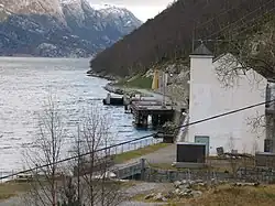 The Flørli Power Station is a hydroelectric power station located on the shores of Lysefjord in the municipality Sandnes in Rogaland, Norway. The station was built in 1918 as the first in Lysefjord, from where it delivered power to Stavanger.[1] The turbine hall was built in 1917 in Jugendstil, it is 80 m long, 9 m wide and stands 12 m tall. The water was supplied via two penstocks along which were built a cabled railway and a wooden stairway with 4,444 steps.[2][3]