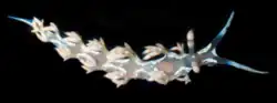 Body is elongate, narrowing posteriorly.[5] Rhinophores are lamellate, club-shaped and with white bands.[5] Cerata are arranged into clusters in two rows along the dorsum.[5] Background color is translucent gray with thick white or yellow patches running between the cerata clusters, on the margin of the dorsum.[5] A submarginal row of opaque white spots present along the sides of the body.[5] Three white or yellow patches are on the head.[5] Oral tentacles are long, translucent and white at the tips.[5] Cerata are translucent with a brown or orange band about a third of the way down from the tip.[5] The maximum recorded body length is 25 mm.[5][6]