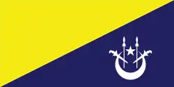 Flag of the Head of Royal Ceremonies | A yellow-blue per bend divided flag with a white crescent and star and two white kris and spears in the bottom right. |