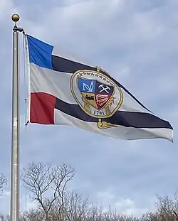 In proportion, the flag is six feet on the pole length and nine feet on the fly length and is divided into three equal horizontal divisions. In the upper pole corner is a two-foot canton of azure blue representing loyalty. In the lower pole corner is a like canton of red signifying bravery. The entire center division is white denoting faith.[9] From the blue and red cantons, running parallel with the fly of the flag, are two equal size stripes of black and white representing coal and marble, respectively. The stripes running from the blue canton are white above and black below. The stripes running from the red canton are black above and white below.