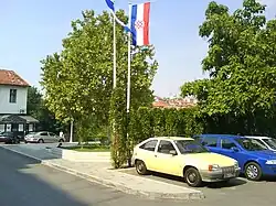 In 1997 and 1998 the Constitutional Court of the Federation of Bosnia and Herzegovina ruled its usage in office unconstitutional.[2][6] As an unofficial flag of Bosnia and Herzegovina's Croats, it is present in the office of Croat member of state presidency,[7][8][9] as well as in many Croat-majority municipalities and schools in the country.[10] Croatian National Assembly uses it regularly, just as all mainstream Croat political parties in Bosnia and Herzegovina.