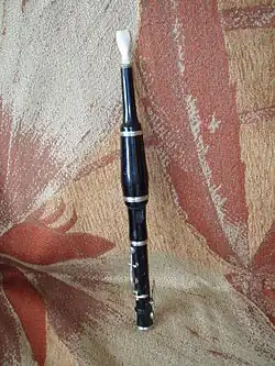 The flageolet is a woodwind instrument and a member of the family of duct flutes that includes recorders and tin whistles. There are two basic forms of the instrument: the French, having four finger holes on the front and two thumb holes on the back; and the English, having six finger holes on the front and sometimes a single thumb hole on the back. The latter was developed by English instrument maker William Bainbridge, resulting in the "improved English flageolet" in 1803.[2] There are also double and triple flageolets, having two or three bodies that allowed for a drone and countermelody. Flageolets were made until the 19th century.[3]