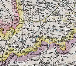 The area of the Flatow district originally belonged to the Netze District, which was annexed by Prussia in the First Partition of Poland in 1772.[1]  In 1815, the area around Flatow became part of Regierungsbezirk Marienwerder in the province of West Prussia. The Flatow district was founded on 1 April 1818. It consisted of the five towns Flatow, Kamin, Krojanke, Vandsburg and Zempelburg.[2] The capital of the district was the town of Flatow. From 1829 to 1878, West Prussia and East Prussia were united to form the Province of Prussia, which belonged to the German Empire from 1871. The district was subjected to Germanisation policies.
