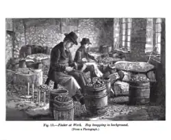 In times of war, millions of gun flints were needed and in the United Kingdom, mining flint and then knapping it became a substantial cottage industry around Brandon, Suffolk, an area that previously saw large scale flint mining in the Neolithic area.[11] In 1804, Brandon was supplying over 400,000 flints a month to the British military.[8] However flint knappers suffered from silicosis, known as Knappers Rot due to the inhalation of flint dust.[12] It has been claimed this was responsible for the early death of three-quarters of Brandon gun flint makers.[13]