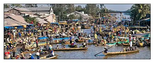With two deltas from both the northern Red River and the southern Mekong River, floating markets were an important aspect of greater aquaculture-based society consisting of floating communities that inhabited the riversides of Vietnam.[1][2] Archaeologists have found evidence that extensive trading networks likely existed in Vietnam's river deltas from as far back as 4,500 years ago.[2][3] As far back as the 7th century, the southern riverways of the Mekong Delta were seen as prime migratory opportunities for those farther north.[4] Many of the communities consisted of cultural groups now associated with modern-day ethnic groups, such as Kinh, Chams, and Khmer.[4] The intersections of major riverways become major points of commerce and led to the proliferation of on-ground and floating markets.[4] Although economic growth and emerging technology over the 19th century provided alternative commercial avenues, floating markets remained a central meeting place into the 21st century as road infrastructure gradually developed in the Delta regions.[5] There have been increased efforts to preserve the traditional appearances of some floating markets as a form of both eco-tourism and cultural tourism.[6]