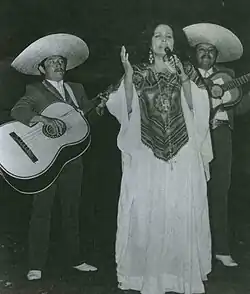 Famed for her melodious voice and unique singing style, hence the nicknames "La Sentimental" ("The Sentimental One") and "La Voz Que Acaricia" ("The Voice That Caresses"), Flor Silvestre was a notable interpreter of the ranchera, bolero, bolero ranchero, and huapango genres. She recorded more than 300 songs for three labels: Columbia, RCA Víctor, and Musart. In 1945, she was announced as the "Alma de la Canción Ranchera" ("Soul of Ranchera Song"),[5] and in 1950, the year in which she emerged as a radio star, she was proclaimed the "Reina de la Canción Mexicana" ("Queen of Mexican Song").[6] In 1950, she signed a contract with Columbia Records and recorded her first hits, which include "Imposible olvidarte", "Que Dios te perdone", "Pobre corazón", "Viejo nopal", "Guadalajara", and "Adoro a mi tierra". In 1957, she began recording for Musart Records and became one of the label's exclusive artists with numerous best-selling singles, such as "Cielo rojo", "Renunciación", "Gracias", "Cariño santo", "Mi destino fue quererte", "Mi casita de paja", "Toda una vida", "Amar y vivir", "Gaviota traidora", "El mar y la esperanza", "Celosa", "Vámonos", "Cachito de mi vida", "Miel amarga", "Perdámonos", "Tres días", "No vuelvo a amar", "Las noches las hago días", "Estrellita marinera", and "La basurita", among others. Many of her hits charted on Cashbox Mexico's Best Sellers and Record World Latin American Single Hit Parade.[7] She also participated in her husband Antonio Aguilar's musical rodeo shows.