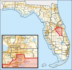 From 2003 to 2012, it encompassed most of rural eastern Hillsborough County, northern parts of Pinellas County (including Clearwater) and the Gulf coast of Pasco County (including New Port Richey). The redistricting on January 3, 2013, completely reassigned the boundaries of the 9th district to mostly Osceola County with central Orange County plus northeastern Polk County,[5][6] while the former 9th district became parts of the 10th, 11th, 12th (Pasco County) or the 14th district which split Hillsborough County with the 15th and 17th district. The 2013 redistricting also expanded the State of Florida from 25 to 27 districts, adding 2 in Miami - Dade.