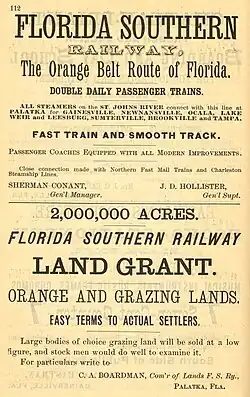 The Florida Southern Railway was a railway that operated in Florida in the late 1800s. It was one of Florida's three notable narrow gauge railways when it was built along with the South Florida Railway and the Orange Belt Railway. The Florida Southern was originally chartered to run from Lake City south through central Florida to Charlotte Harbor.[1] However, with the influence of Henry B. Plant, it operated with two discontinuous segments that would be part of the Plant System, which would later become part of the Atlantic Coast Line Railway.[2]