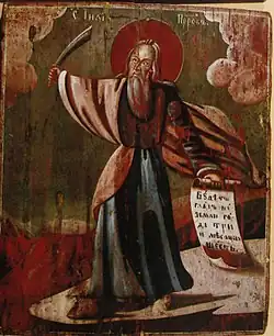 Nicholas' main functions (patron of cattle and wild animals, farming, beekeeping, connection with the afterlife, and correlation with the relics of the bear cult), the opposition of "merciful" Nicholas to the "terrible" Ilya the prophet in folklore legends indicates, according to Boris Uspenskij, that there are traces of the cult of the pagan deity Velesa.[54]