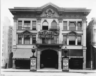 Follies Theater, originally Belasco Theater, was designed by Abram M. Edelman for David Belasco and his partner M.E. Mayer. Built as part of a three-story mixed-use building in 1904,[1] the theater and the building it was in were both built in less than four months.[2] The theater sat 1,200[3][4] and in 1907 was listed as one of the twenty largest theaters in Los Angeles.[1] Its first showing was The Wife on August 29, 1904.[3]
