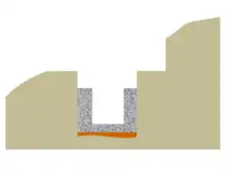 The aqueduct is usually buried on the hillside on the left bank of the Cher. A trench is dug into the slope, after leveling the ground over a width corresponding to the aqueduct's right-of-way (phases 1 and 2). A layer of clay mixed with gravel, designed to level the bottom of the trench, is then deposited at the bottom of the trench (phase 3). The mortar invert is then shaped and leveled at the bottom of the trench; it temporarily supports a formwork of planks used to cast the aqueduct's pedestals (side walls), also built in mortar (phase 4). A vault of limestone or siliceous stone, cemented with lime mortar, probably mounted on a temporary longitudinal truss in the shape of an inverted "V", caps the canal; the same mortar is also applied to the inside and outside of the vault (phase 5). The trench is then backfilled until the aqueduct vault is completely or partially concealed (phase 6). At the time the canal was built, no waterproof mortar was used on the inside of the invert and pedestals, as the rapid development of limestone concretions seems to have taken its place;[21] the waterproof tile mortar (opus signinum) that covers the walls and invert on certain sections was applied during a repair campaign.[22] The canal (or specus) is approximately 0.50 m wide and 0.60 m high, with an arch height of 1.30 m;[23] these are average dimensions, but they vary little along the aqueduct's length.