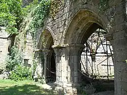 The monastery was built in granite in the Angevin Gothic style, transitional between Romanesque and Gothic. The truncated church is the most intact structure remaining, and contains the tomb of either the foundress Béatrice de Machecoul or her daughter Jeanne, Vicomtesse de Thouars, consisting of a recumbent effigy (gisant) in an arched recess (arcosolium) with small figures.[5] There are also substantial remains of the chapter room but the rest of the former structures are in ruins.
