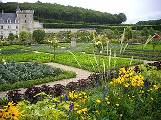 The Ornamental Kitchen Garden is an edible landscape on the grounds of the château of Villandry, located in the Loire Valley region of France. The Italian Renaissance-style garden is composed of nine square patches, each featuring a geometric design of flowers and vegetables whose design layouts change with each bi-annual planting. These patches are lined with neat box hedges, and each displays vegetables of different colours such red cabbage, beetroot and blue leek. Each year, forty species of vegetables within eight plant families are planted.[34]