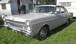 The ZA Fairlane series, introduced in March 1967,[14] was designed and built in Australia, although its front-end styling resembled the American Ford Falcon sedan of that year (except for the quad headlights). The body shape was similar to the 1966–67 US Fairlane sedan, however. Offered as the Fairlane and the Fairlane 500, it was based on the Australian XR Falcon.[14] The 2819 mm wheelbase of the Falcon was stretched to 2946 mm, the front and centre body sections were retained and a new twin-headlight grille was added.[14] The rear quarter panels and boot from the US Fairlane were used, and square taillights (sourced from the 1966 USA Fairlane) replaced the round units used on the Falcon.[14]