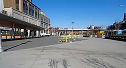 In between the two buildings is the Fordham Plaza Bus Terminal (4750 Third Avenue),[21] encompassing Third Avenue and the former right-of-way of Park Avenue on a "bridge-structure" over the Metro-North Railroad tracks. From 1997[22] to early 2013,[21] this was also the location of a cobblestone-paved outdoor market space. This included tents and stands for items such as fruit. At its north end were two concession stands built into the southern entrance stairs to the Metro-North station. Throughout the plaza were several obelisk-like pillars, some of which were combined with canopies and glass bricks to form bus shelters.[5][23][24]