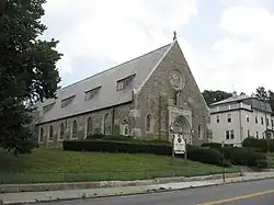 Upham Memorial Church, a small Methodist church at the corner of Wachusett and Patten Streets, was completed in 1901. Previously, Forest Hills Methodist Society had been holding services in a rented hall in the Forest Hills area. Designed by James G. Hutchinson in a Tudor Revival style, this wooden church was built with a corner tower and half-timbering. A later addition was added in 1925.