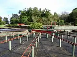 The lake is supertrophic,[4] sometimes resulting in algal blooms.[23] An outlet weir keeps water at a maximum depth of 1.8 m (5 ft 11 in). The catchment is about 11 ha (27 acres), mainly stormwater from neighbouring streets. Rotokaeo now covers 3.1 ha (7.7 acres),[24] but once extended south into the area of the netball courts and BMX track, which was filled in for a rugby ground and then a stock car track. Before urbanisation the lake probably also had a larger area of peat bog.[4]