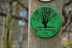 The path is waymarked in both directions by a green circular marker with a black leafless tree and the text: ‘The Forest Way’ 'A walk between Epping Forest and Hatfield Forest'.[2]
