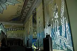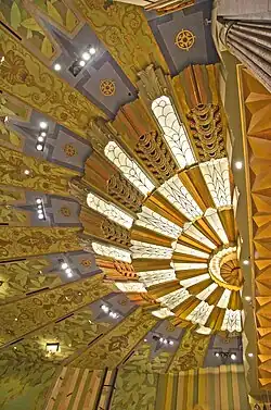 The carpeting represents the ocean and the first floor and lobby signify an underwater seascape while the second floor and balcony illustrates treetops, and the roof has ornamentation representing celestial bodies.[12] Heinsbergen's work in the theater represents two mural styles, with more elaborate three-dimensional imagery and the more artistic and simplistic two-dimensional designed murals and have been said to evoke children's book illustrations of the time.[2] The centerpiece of the theaters interior was a 60-foot (18 m) wide light fixture made of etched glass and plaster in the shape of a sunburst,[3][13] it was accompanied by nine smaller chandeliers representing the stars of the universe.[14]