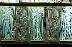 Internally, partitions that were installed in 1975 which converted the theater into a multiplex were removed and the creation of an inner lobby reduced the seating from 2,350 to 1,727 and a hole had to be cut into the buildings south face to allow the installation of new steel structural beams into the attic to support the equipment required for modern amenities.[10][14] Restoration specialists from EverGreene Architectural Arts were brought on to restore Heinsbergen's interior designs as well as the sunburst and chandelier light fixtures.[10] Upgrades to the theater included installing heating and air conditioning systems and soundproofing the venue to make the acoustics suitable for a symphony.[10] The buildings original glass work was cleaned and some replicated using relearned techniques; the metal framework in the leaded glass in the building was replaced using a shiny and reflective zinc to maintain an art deco aesthetic.[10]