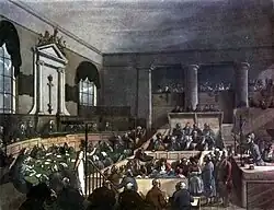 Courvoisier's trial began at the Old Bailey before Chief Justice Nicholas Conyngham Tindal and Justice Baron James Parke,[4] and took three days.[7] It was widely reported in the London newspapers and, among the many titled spectators,[4] was Prince Augustus Frederick, Duke of Sussex, who was seated in a position normally reserved for the Lord Mayor of London.[7] The defence benefited from the generosity of Sir George Beaumont, a longtime employer of Courvoisier's uncle, who donated £50 for the employment of a solicitor and barrister, while the prosecution was led by John Adolphus.[7] Courvoisier pleaded not guilty when the indictment was read.[4]