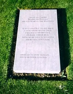 Gleeson was an advisor to men of all faiths in the regiment and kept careful records of their names and addresses so that he could write to the families of those that died.[15][16] He recorded the dates that each Catholic man received the sacrament so he could reassure their families that they had died in a state of grace.[17] Gleeson ended each of his letters with the words "They paid a great sacrifice", which was later used as the title of a book published in 2010 that details the wartime service records of men from Cork.[16] Much of his time was spent answering letters from families in Ireland concerned about the wellbeing of their sons and husbands.[18] At times the task almost overwhelmed him and this is evident in his personal diary when he wrote, in June 1915, "I got 12 letters today; just after reading them. What answering they will take tomorrow. I like to give these poor people all the solace I can, anyhow, but still there's no limit to the sorrowing inquiries. The tragedy of these letters".[11]