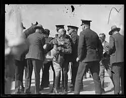 He became famous when, on Saturday 19 March 1932, he upstaged Lang at the opening of the Sydney Harbour Bridge, before a crowd of 300,000 people.[5] He was not a member of the official party but, on horseback and dressed in his military uniform, he was able to blend in with the escort party of NSW Lancers. Lang was about to cut the ribbon to formally open the bridge, when de Groot rode forward and drew his ceremonial sword, attempting to cut the ribbon and declare the bridge open "in the name of the decent and respectable people of New South Wales".[7] While many accounts say de Groot succeeded in slashing the ribbon, at least one eyewitness has disputed the claim and suggested it was probably broken by the hooves of his rearing horse.[8] He said this was in protest that the Governor of New South Wales, Sir Philip Game, had not been invited to perform the ceremony. The Mayor of North Sydney, Hubert Primrose, an official participant at the opening ceremony, was also a member of the New Guard, but whether he was involved in planning de Groot's act is unknown. De Groot was also said to have later joined the White Army, another fascist organisation founded in Victoria in 1931.[9]