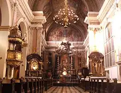 The early-Baroque layout takes the form of a basilica with one nave and two rows of side-chapels. The Baroque main altar was executed by the sculptor Francesco Robba. Frescos in the interior were mostly painted by Matevž Langus in 1845 and 1848–55; two of them were contributed by Janez Wolf) in 1882. Many of the original frescoes were ruined by the cracks in the ceiling caused by the Ljubljana earthquake in 1895. New ceiling frescoes were painted in 1935–1936 in the Baroque trompe-l'œil manner by the Slovene otherwise impressionist painter Matej Sternen.[5][6][2]
