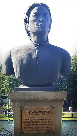 Francisco Maniago was a 17th-century Filipino revolutionary leader who fought the Spanish colonisation of the Philippines. He led a 1660 revolt in the province of Pampanga[1] attacking the bandala system, where locals were forced to sell agricultural products at low prices,[2] and polo y servicio, a form of corvée where locals worked on government projects without pay.[3]