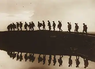 In 1917, Hurley joined the Australian Imperial Force (AIF) as an honorary captain, and captured many stunning battlefield scenes during the Third Battle of Ypres. In keeping with his adventurous spirit, he took considerable risks to photograph his subjects, also producing many rare panoramic and colour photographs of the conflict. Hurley kept a diary from 1917 to 1918, chronicling his time as a war photographer.[8] In it, he described his commitment "to illustrate to the public the things our fellows do and how war is conducted", and his short-lived resignation in October 1917 when he was ordered not to produce composite images—a practice that was especially popular among professional photographers at the time and one that he believed could portray the disgust and horror that he felt during the war in such a way that his audience would feel it too.[9] His period with the AIF ended in March 1918.[10]