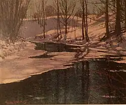 In 1925, Johnston changed his name to the more exotic first name of 'Franz' Johnston.[3] By 1927, he was back in Toronto, working as the principal at the Ontario College of Art.[3] In later years, the artist's work demonstrated a return to a more classical style of landscape painting and revealed a strong fascination with the qualities of light, especially light on snow. This theme recurred in later works, in large narrative paintings of the 1930s and 1940s as well as more intimate examinations of a river valley, the bright blue of the water contrasting with snow-laden banks. His subjects range from the pastoral countryside of the Wyebridge area, to northern Quebec, and the Northwest Territories.[3] He had begun to hold regular solo exhibitions in the 1920s and his paintings found a great following among the public. Unlike many Canadian artists, Johnston was able to achieve considerable financial success in his own lifetime.[3]