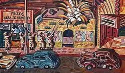 His best known painting is Death of Ruben Salazar (1986), which was one of his police brutality series.[9] He is also known for Nino y Caballo (A vision expressing freedom and joy) (1984), one of the three building-sized murals on the Victor Clothing Company Building.[10]