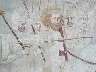 The Szécsényi brothers were one of the earliest domestic partisans of Sigismund of Luxembourg, who arrived to Hungary to validate the marriage agreement with Queen Mary. Sigismund established a court as Margrave of Brandenburg, after permanently settled in Hungary following the Treaty of Győr. On several occasions, Frank Szécsényi instructed the chancellery's clerks to issue charters.[9] After the queens' capture and imprisonment, Sigismund' influence grew which reached its peak at the rescue of Mary and his coronation as co-ruler on 31 March 1387. For his loyalty, Szécsényi was transferred to the rich urbanized Upper Hungary, where he was installed to the positions of ispán of Zólyom, Hont and Nógrád Counties, serving there until 1390.[10] Beside the ancient family estates in the region, Szécsényi was granted numerous lands and villages by Sigismund in the following years. As lord of the territories, he took an active role in the spread of ideological legitimacy of the relatively unpopular Sigismund. Since the Angevin age, the Saint Ladislaus legend provided the subjects for numerous murals painted in medieval churches in Hungary. Saint Ladislaus I of Hungary, who was the ideal of the perfect monarch, warrior and Christian for that time, was deeply venerated by Sigismund. As donator, Szécsényi ordered the preparation of murals in the churches of Rimabánya, Karaszkó, Kiéte and Rimabrézó (today Rimavská Baňa, Kraskovo, Kyjatice and Rimavské Brezovo in Slovakia, respectively),[11] which depict Biblical scenes or details from the Ladislaus legend. In the latter respect, the figure of Sigismund portrayed Ladislaus, drawing parallels between the two monarchs.[12]