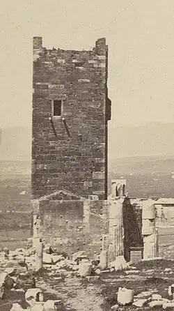 The date of the tower's construction is unclear and now impossible to reconstruct with any certainty following the tower's demolition.[12] Construction is usually ascribed to the Florentine Acciaioli family, who ruled the Duchy of Athens between 1388 and its fall to the Ottoman Empire in 1458, since it was they who converted the Propylaia complex into a palace.[13] However, according to medievalist Peter Lock, the tower "might equally be ascribed" to the first dynasty of Frankish dukes of Athens, the 13th-century de la Roche family, who also had a residence on the site, of which no details are known.[14] In the nineteenth century, the classicist John Pentland Mahaffy tried to argue that the tower dated to the occupation of Athens by the Venetian commander Francesco Morosini between 1687 and 1688; his theory was disproven by the existence of engravings from the occupation, which showed that the tower predated it.[2]