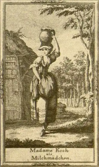 Following to the closure of the theatre in Weimar due to fire in 1774, Koch went to Gotha[4] to the newly founded theatre, Ekhof-Theater, in 1775.[3] She was particularly successful in the operas of the conductor and composer Georg Benda, and performed in the premieres of his Romeo und Julie (1776) and Walder (1776).[4] In 1777, Koch left Gotha and became a member of Bondini's company in Leipzig, where she was an active singer until she retired from the stage in 1787.[4]