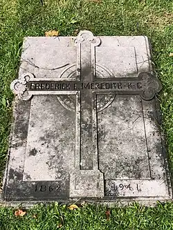 Meredith died shortly before his eightieth birthday (‘birthdays are not the kind of thing one wants to commemorate’ he once said), after an illness of several weeks. He died at his home on Pine Avenue in the Golden Square Mile shortly after eleven o’clock of that morning, predominantly of old age. Meredith's funeral was one of the largest ever seen in Montreal, and out of respect the practice division of the courts were closed for the day.[5] The city's legal and business communities turned out in full force, and both were represented among his pall-bearers who included Sir Edward Beatty, Sir Montagu Allan, Sir Herbert Holt and Chief Justice R.A.E. Greenshields. He was buried in the Meredith plot at Mount Royal Cemetery, Montreal, next to his cousins, Sir Vincent Meredith and Charles Meredith and their respective wives.