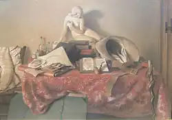 In 1848, Lock painted an interior view of his room in Montreal, one of only two still-life paintings by Lock yet identified, showing a table cluttered with books, personal items and his "tools of the trade," that's been titled The Artist's Possessions (17.4 x 24.5 inches).[13] During the next seven years, Lock painted subjects in and around Montreal, and westward as he traveled along the developing waterways through much of populated Ontario, most notably Bytown, later renamed Ottawa by Queen Victoria in 1854 during the time that Lock was there. The report by Harper[1] that Lock "visited... in Manchester Vermont 1849" may be based on a possibly misleading statement in a letter dated Oct. 28, 1945 by Orrin E. Dunlap to the New York Historical Society re: "Newly Discovered American Portrait Painters," stating: "F. F. Sherman reported finding in Manchester (VT) a pastel portrait signed, F.W. Lock, dated 1849…".[14]