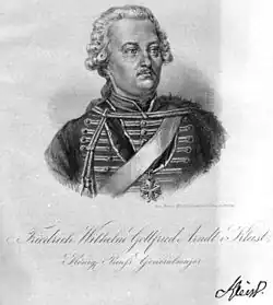 Friedrich Wilhelm Gottfried Arnd von Kleist, (29 August 1724 – 28 August 1767)[1] was a Kingdom of Prussian military officer, who rose to the rank of major general. In the Seven Years' War, he organized and commanded the Freikorps Kleist. He was also known as Green Kleist for his command of the Green Hussar regiment, and to distinguish him from the 58 other members of the Kleist family who served in the war. He received the Order Pour le Mérite and is one of the 25 generals depicted on the Equestrian Statue of Frederick the Great.