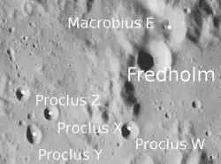 Fredholm is a small lunar impact crater that is located in the rugged ground to the west of the Mare Crisium. It was named after Swedish mathematician Erik I. Fredholm.[1] It was previously designated Macrobius D. It lies midway between the prominent craters Macrobius to the north and Proclus almost due south.