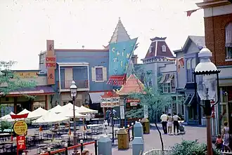 Restaurants and refreshments included Borden's Old Fashioned Ice Cream Parlor;[78] F&M Schaefer Brewery, an old-fashioned brewery sponsored by Schaefer Beer;[79] Kandy King Candy Shop;[80] Lipton's Inn and Lipton's Tea House;[78] New York Coffee House;[78] and Welch's Grape Juice Bar, a beverage bar located near the New England vineyard.[78] Shops included a print shop to purchase vintage-style posters, an apothecary shop, a glass blower shop, and other stores. Unlike Disneyland, where the shops were connected to each other, the stores were generally separated internally, like actual shops on city streets. Macy's recreated its original Manhattan store, Macy's Herald Square.[80] There was also a live street show that included a German band, an 1880s Tammany Hall speech, a political pep rally, campaigning suffragettes, and a New York gangland robbery of the Little Old New York Bank.[59][20]