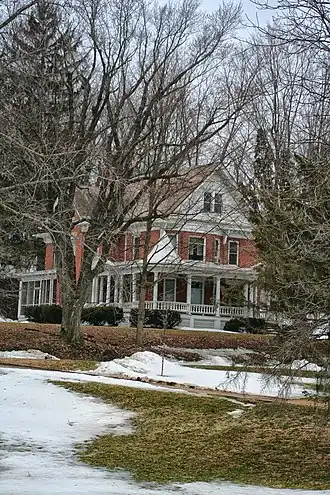 - In 1906 Nicholas and Elsbeth Freitag built a new house (pictured) in the then popular Queen Anne style. It has a limestone foundation and red brick walls, with eaves supported by ornamental brackets, leading to a gable and hip roof. A one-story veranda wraps the front of the house, with a turret at one corner. Inside, the house has hardwood floors and plaster walls with varnished woodwork. Especially notable are some parquet floors and a wooden grillwork. The house has no fireplaces, as it was heated by radiators from the start. With many of the original finishes and furnishings intact, the Freitag house is one of the finest Queen Annes in Green County.[2][7]